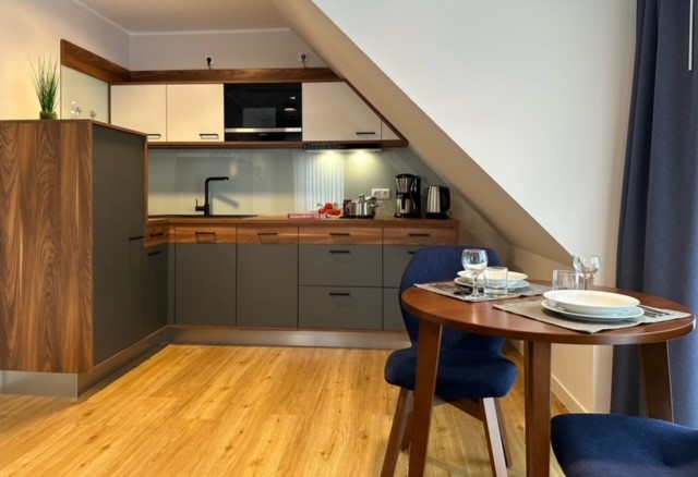 Die Wohnung K6 im Gästehaus Käptn befindet sich in der 1. Etage. Es verfügt über ein separates Schlafzimmer mit einem Doppelbett, ein Wohnraum mit Flachbildschirm-TV,  Essgruppe, Küchenzeile (ausgestattet mit Geschirrspülmaschine, Geschirr, Kaffeemaschine, Mikrowelle. Wasserkocher, Kühlschrank und einem Ceranfeld), Bad mit Dusche und WC, Südbalkon.